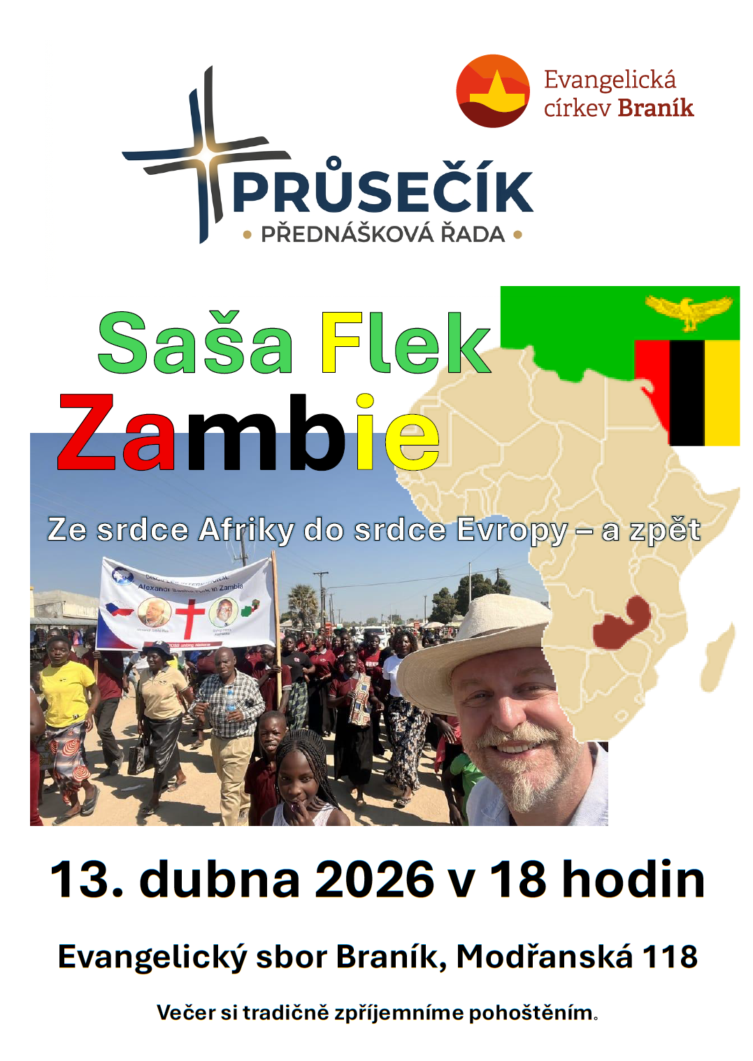 1985 přijel do ČSSR studovat mladý zambijský křesťan Henry Kashweka. V r. 1988 byl komunistickými úřady vyhoštěn za „svádění mládeže“ – ale mezitím tu stihl zasít semínko evangelia. Saša Flek se po 40 letech vydal zpět do Zambie, aby vydal svědectví o úrodě, která z toho semínka vzešla – nově založených sborech, organizacích a v neposlední řadě o překladu Bible21. Nezapomenutelné tři týdny uprostřed afrického křesťanství, přírodních parků a hlavně fantastických Božích lidí přijde Saša představit do Braníka slovem, zvukem i obrazem.